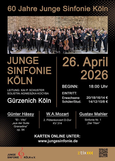 Die Junge Sinfonie Köln (JSK) feiert ihr 60-jähriges Jubiläum mit einem ganz besonderen Geburtstagskonzert. Mit Gustav Mahlers Symphonie Nr. 1 steht ein Werk auf dem Programm, das mit höchsten technischen und musikalischen Anforderungen jedes Orchester an seine Grenzen führt und mit einer Besetzung von 90 Musiker*Innen die Dimensionen der Symphonik voll auskostet. Der Beiname „Der Titan“ ist Programm und ein gefundenes Fressen für die JSK, die mit ihrem Dirigenten Kai P. Schuster das ideale Paar für spätromantische Gipfelstürme ist! Flankiert wird dieses epische symphonische Drama abwechslungsreich von dem freudestrahlenden zweiten Flötenkonzert von Mozart und von Orchestergründer Günther Hässys temperamentvoller Komposition "El Vito". Zu Beginn: lässt die JSK einen leidenschaftlichen Feuersturm durch den Saal toben, bevor Agnieszka Kocyba mit einmalig farbenreichem Ton und Virtuosität das Solokonzert vibrieren lässt.